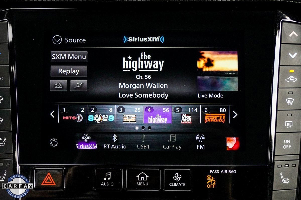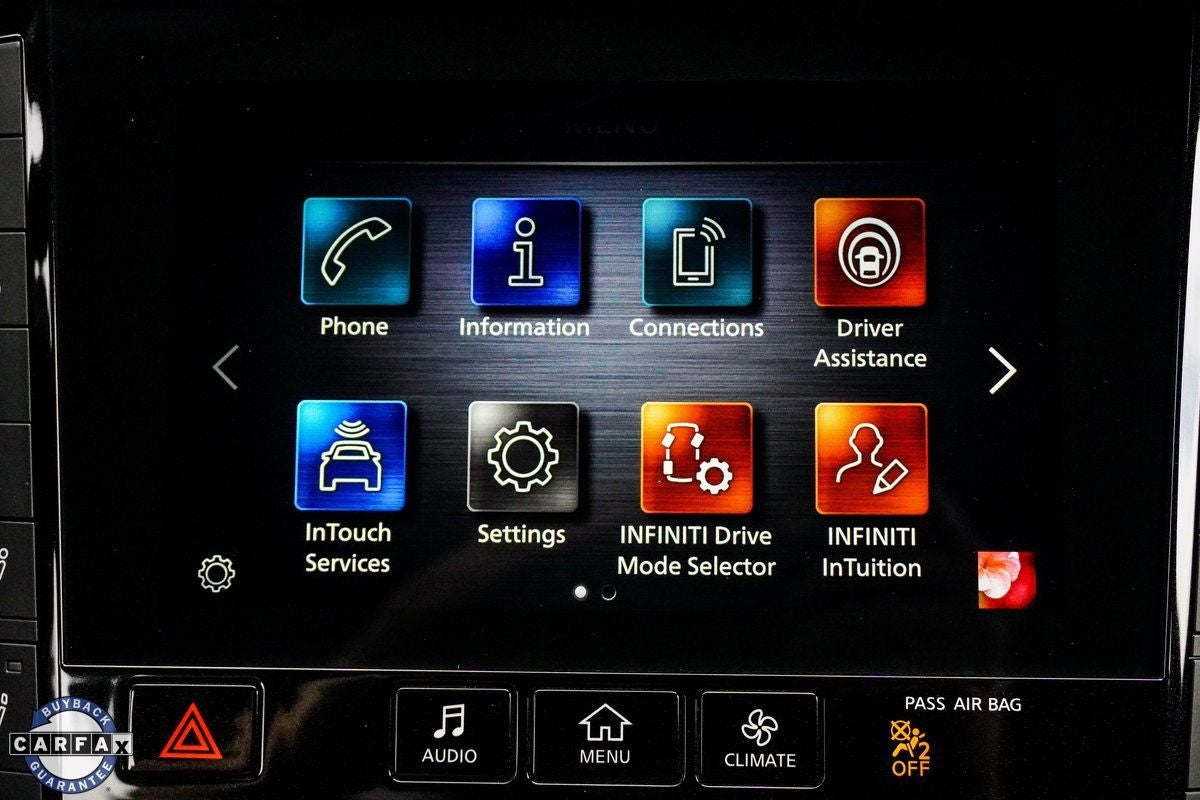 - Radio: AM/FM Audio System -inc: 6 speakers, INFINITI InTouch dual display system w/upper 8" and lower 7" touch screens, wireless Apple CarPlay, Android Auto, HD Radio technology, SiriusXM radio w/advanced audio features and 90-day complimentary trial, INFINITI voice recognition, INFINITI InTouch services, Siri eyes free and Wi-Fi hotspot